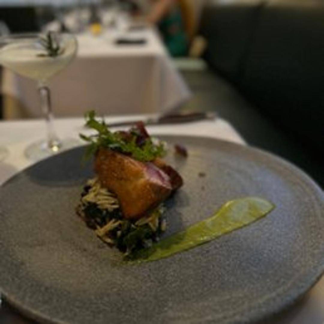 Pan-seared Duck Breast, with crispy skin and a rich flavor, served with seasonal fruit compote and a drizzle of balsamic glaze.