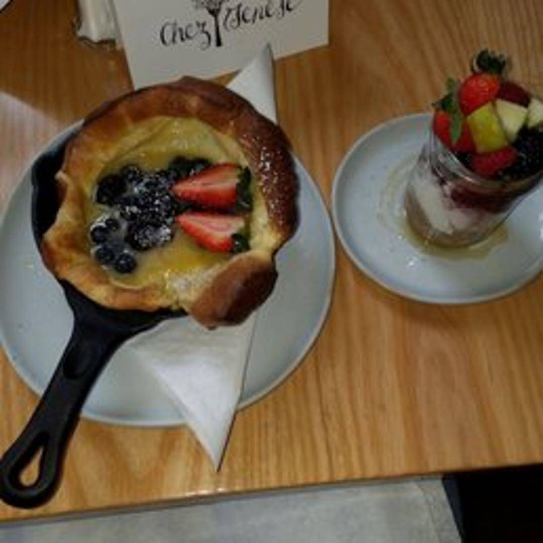 A spectacularly light and airy oven-baked pancake, rising dramatically in the skillet to create a golden, soufflé-like texture. Traditionally served with a dusting of powdered sugar, a squeeze of fresh lemon, and a side of seasonal fruit, offering a delightful and unique breakfast or brunch experience.