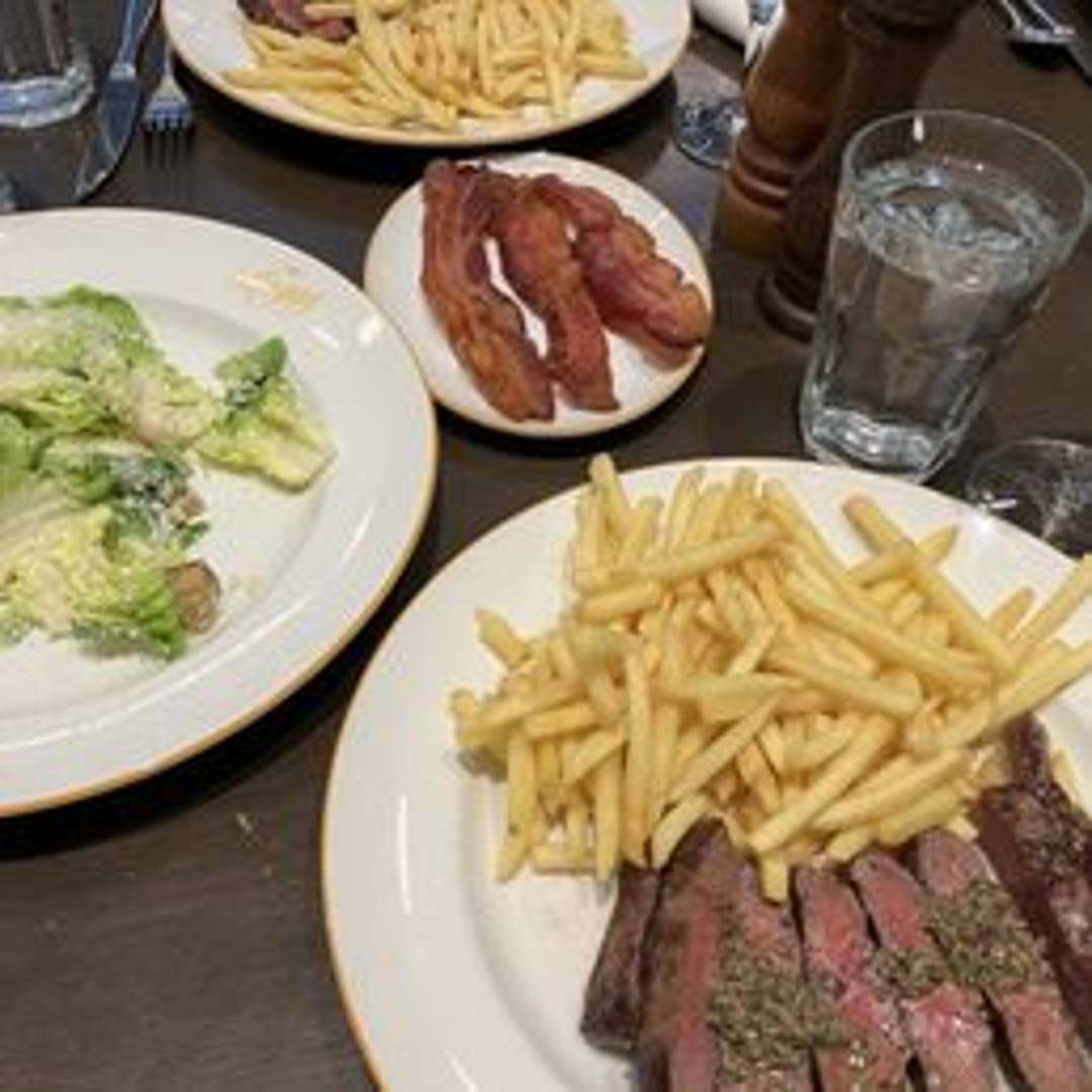 Grilled steak served with crispy golden fries and a choice of sauce, such as béarnaise or au poivre.