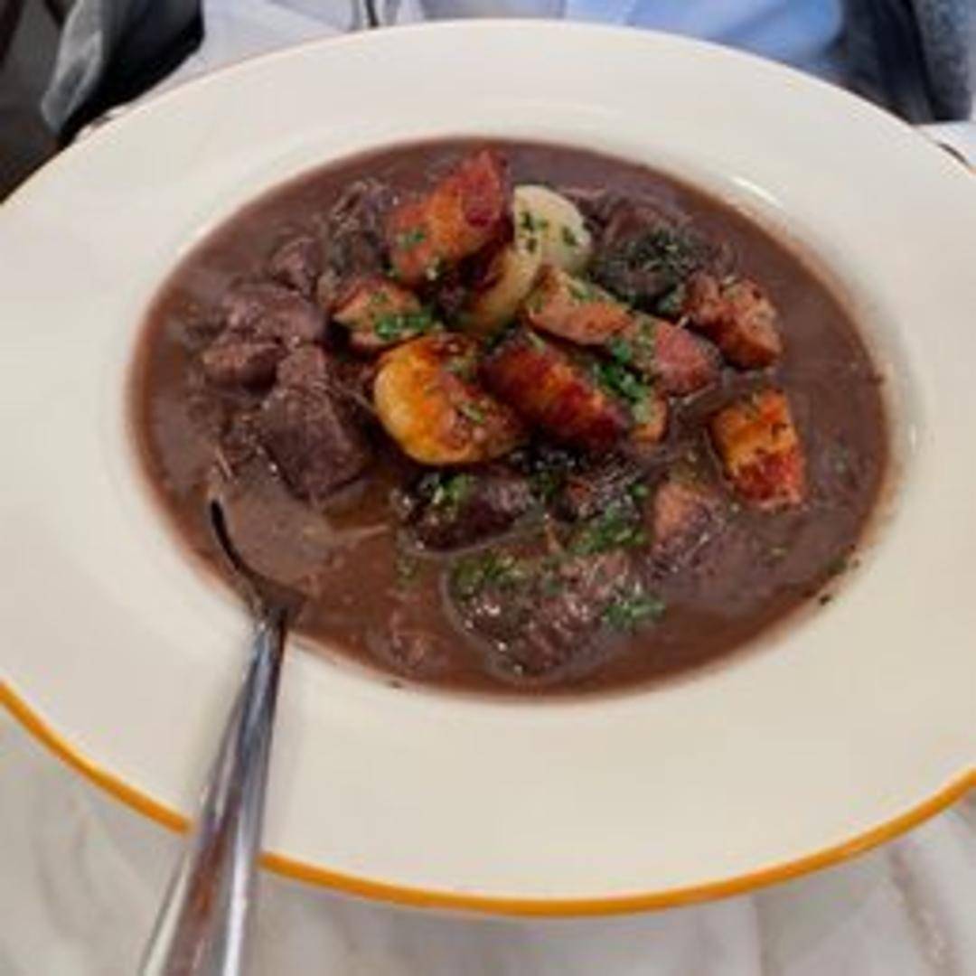 Tender pieces of bison braised in red wine with mushrooms, onions, and bacon lardons, served over creamy mashed potatoes.