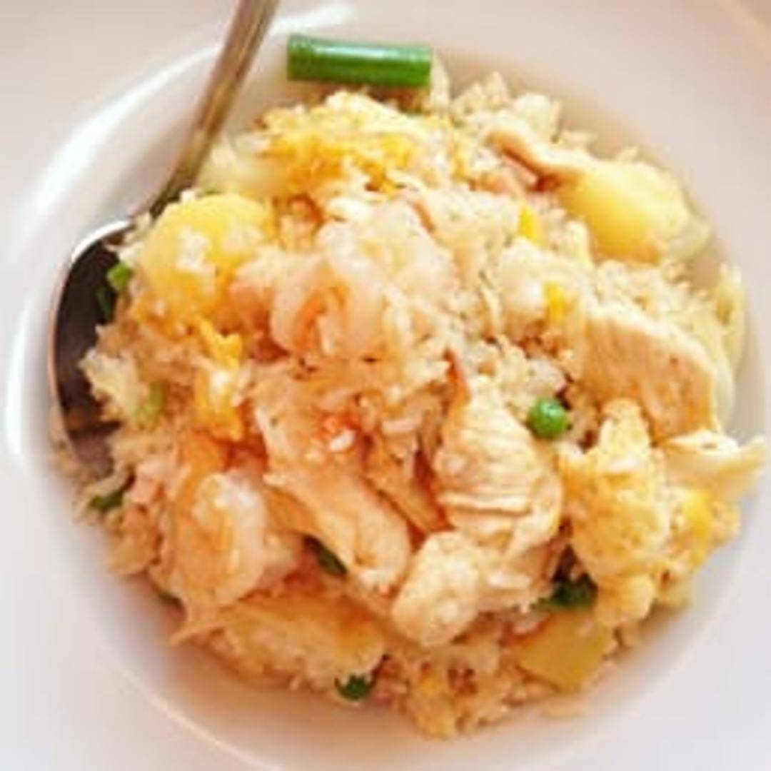 Fragrant fried rice with shrimp, chicken, pineapple chunks, raisins, cashew nuts, onions, carrots, and a touch of curry powder. Served in a pineapple shell.