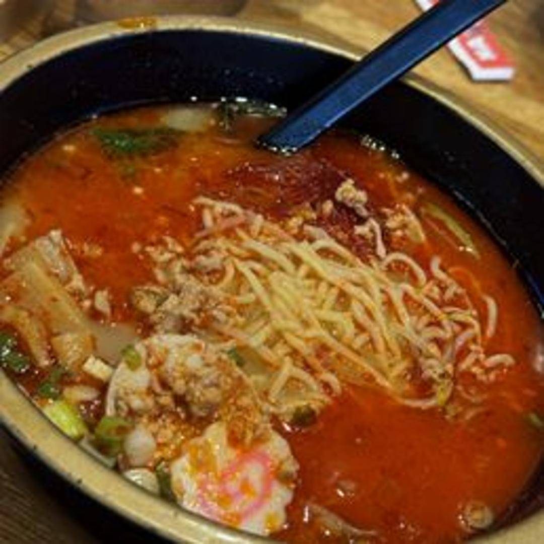 Spicy ramen with a creamy sesame-based broth, topped with ground pork, chili oil, and vegetables.