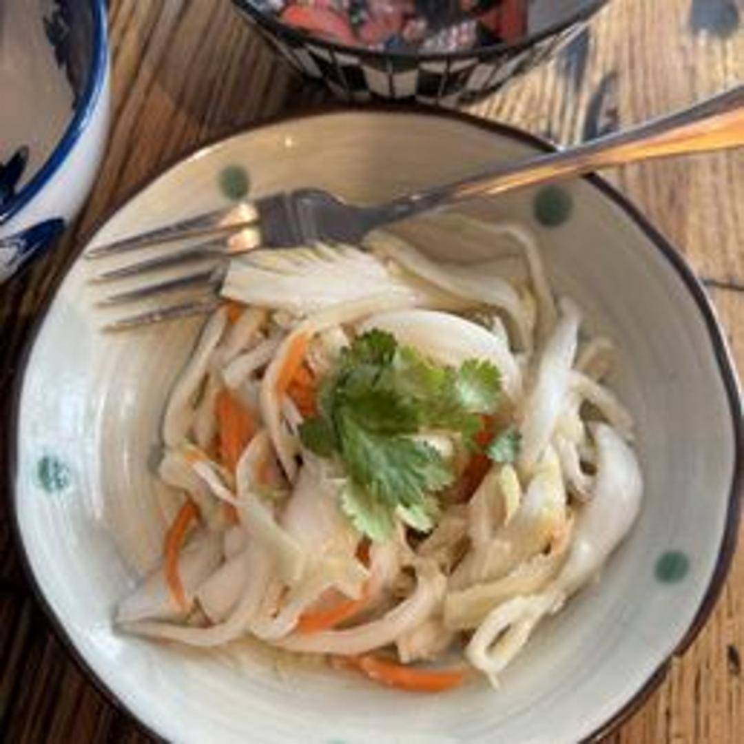 A tangy and refreshing side dish of fermented cabbage, seasoned with spices.