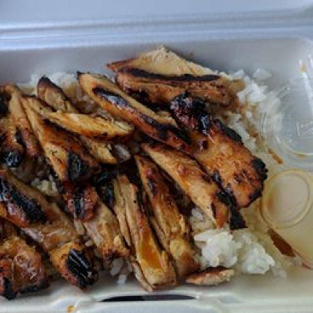 A bowl of steamed rice topped with tender pieces of grilled or stir-fried chicken. Often served with a light sauce or seasoning.