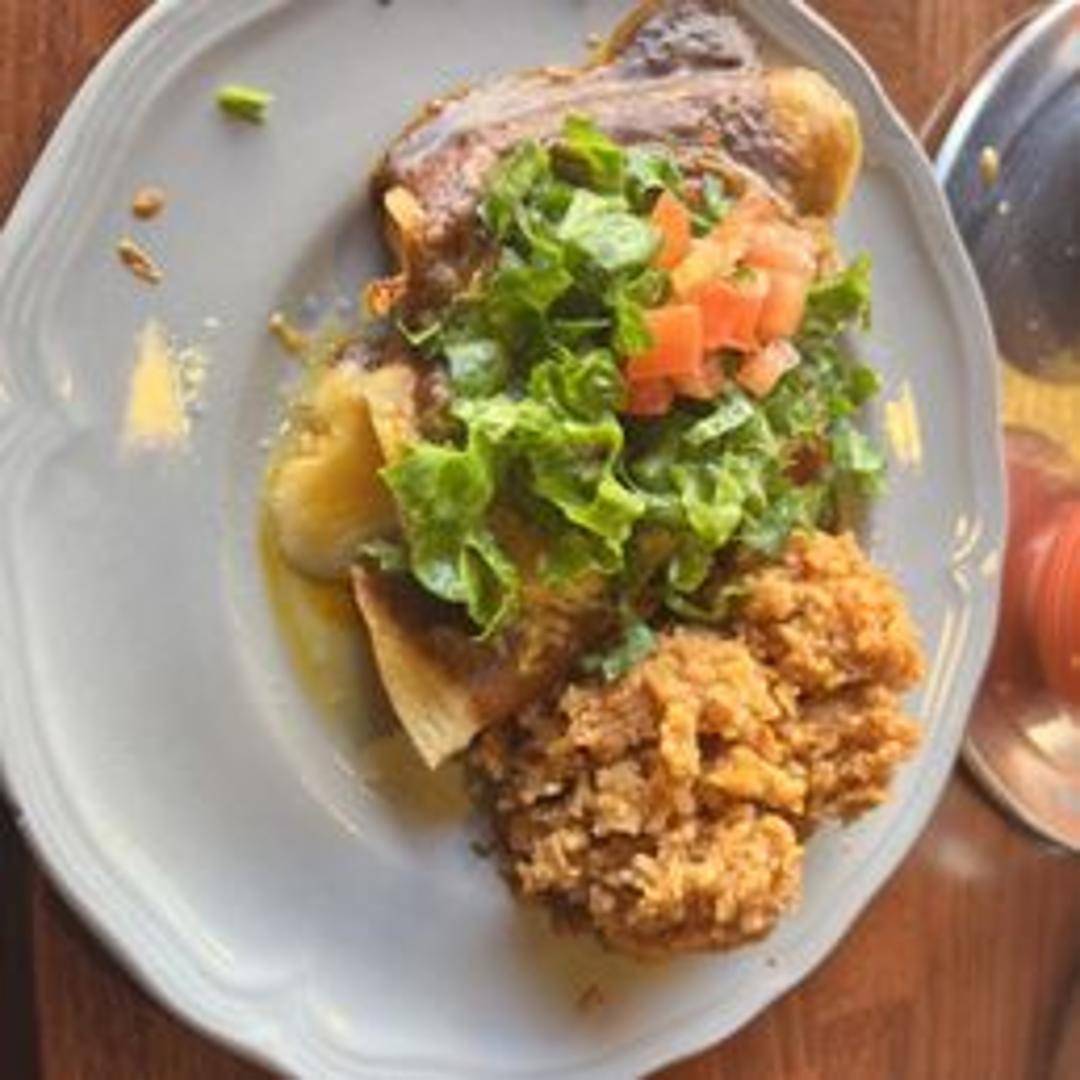 Corn tortillas filled with cheese, smothered in Chile Colorado sauce, and topped with melted cheese. Served with rice and beans.