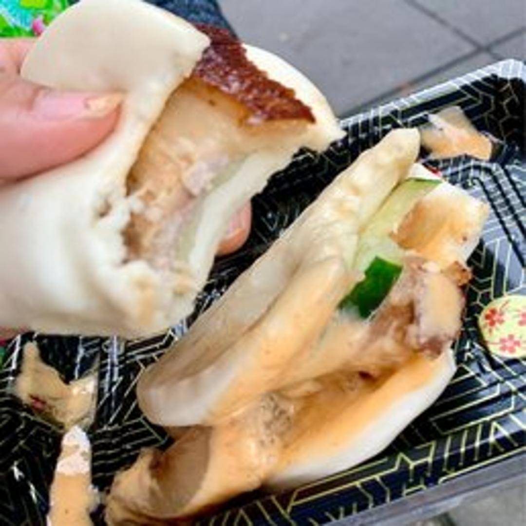 Succulent slices of tender, slow-braised pork belly, often glazed with a savory and slightly sweet barbecue-style sauce, nestled within soft, fluffy steamed buns. These 'Q Buns' offer a delightful contrast between the melt-in-your-mouth pork and the pillowy texture of the bao, frequently garnished with fresh cilantro and pickled vegetables.