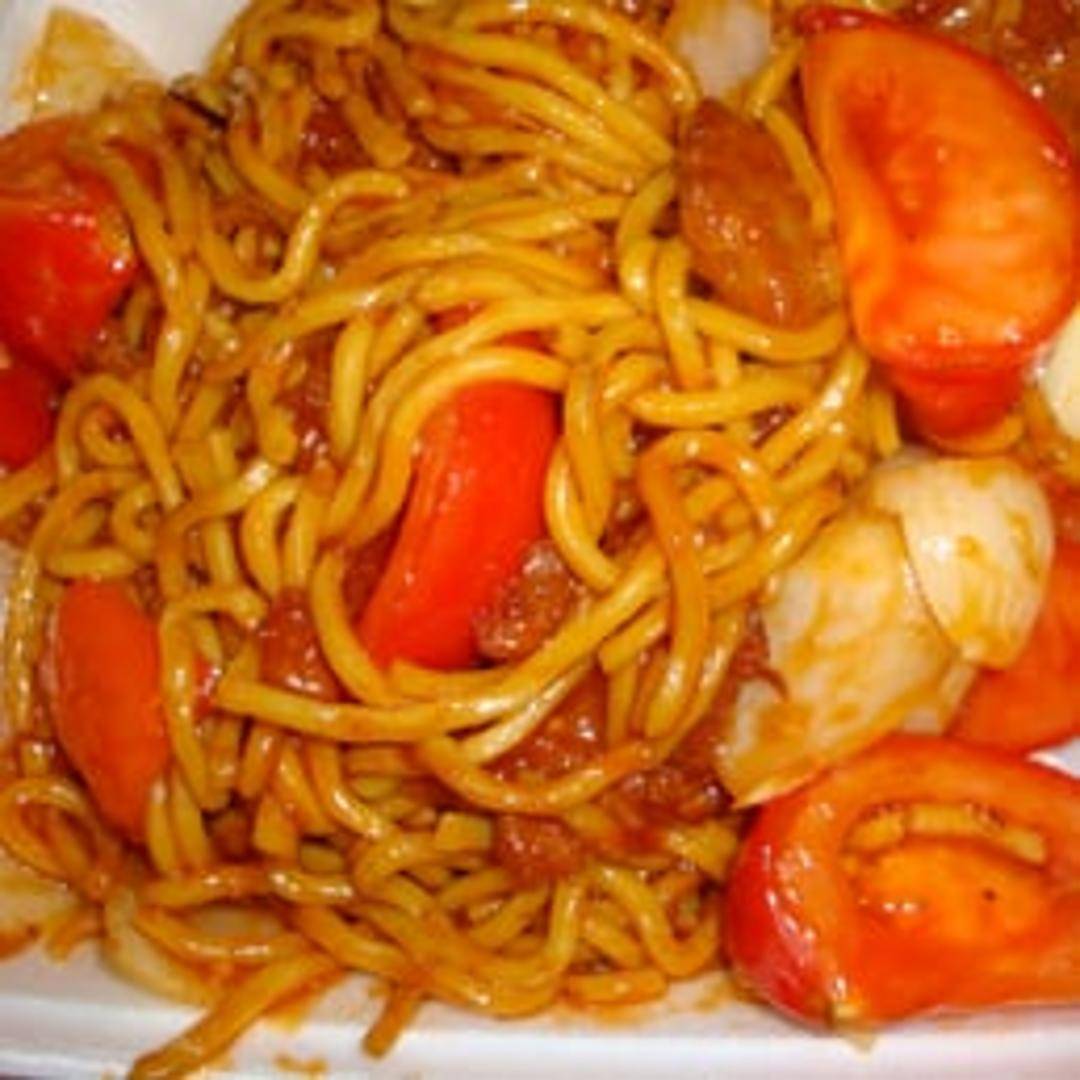 Savory stir-fried egg noodles with slices of tender beef, diced tomatoes, and crisp vegetables in a flavorful sauce.