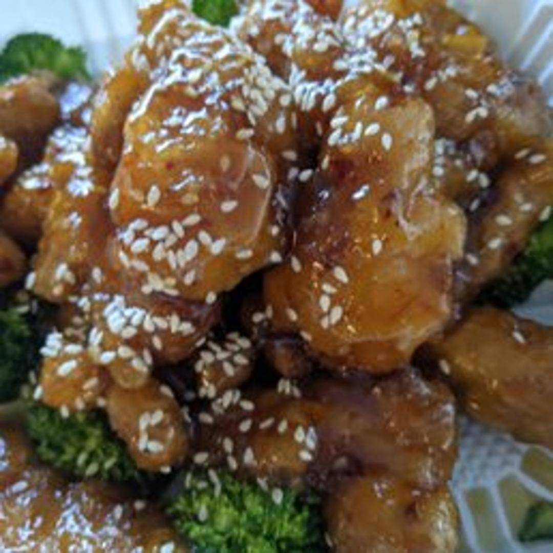 Crispy, deep-fried chicken pieces coated in a sweet and savory sesame sauce. The sauce typically contains soy sauce, honey, sesame oil, and a hint of garlic and ginger, and is heavily sprinkled with sesame seeds.