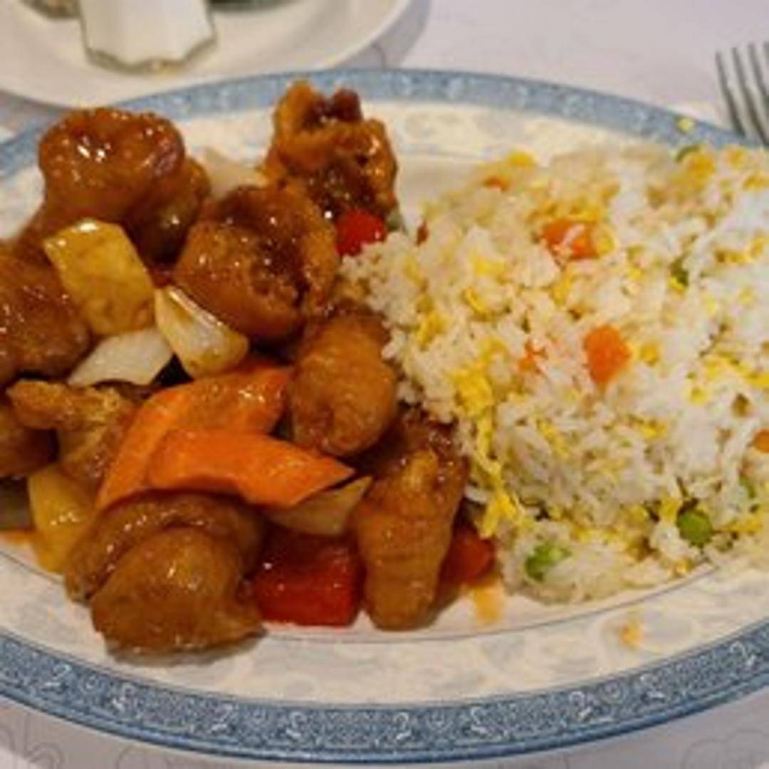 Tender pieces of pork, lightly battered and deep-fried to a golden crisp. Tossed in a vibrant sweet and sour sauce made with pineapple, bell peppers, and onions. Served hot.