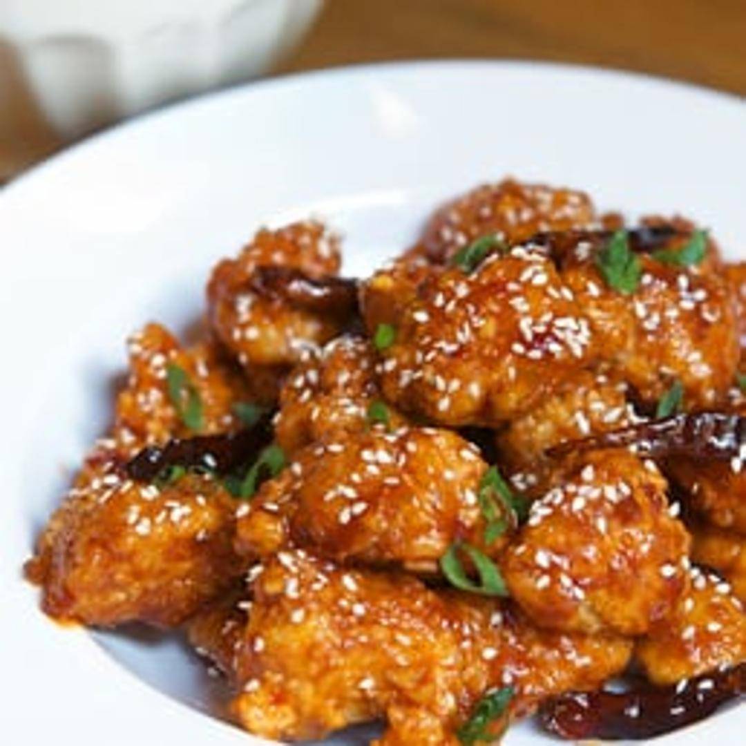 Crispy, bite-sized pieces of chicken coated in a sweet and savory sesame sauce. Served hot.