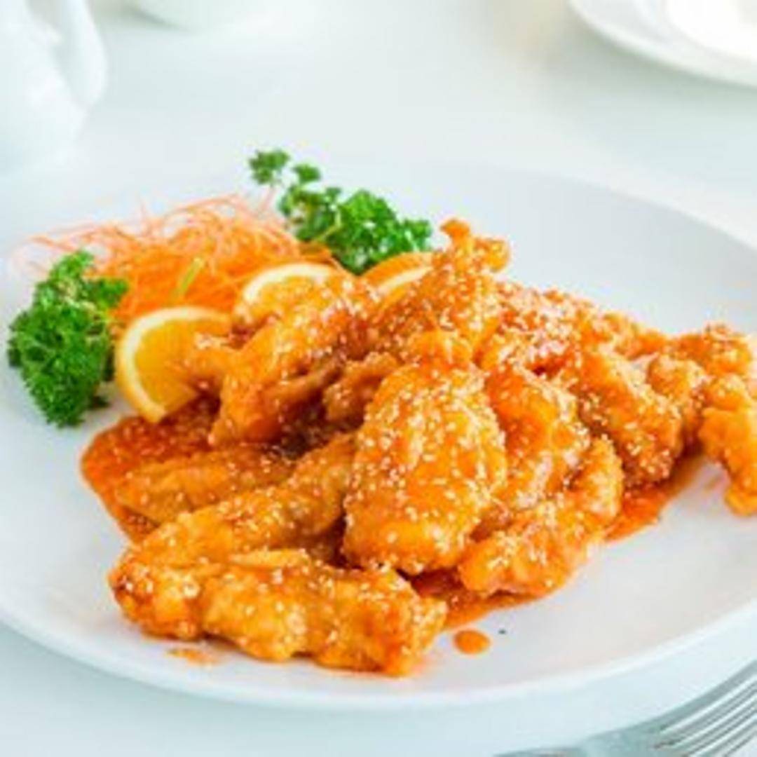 Tender pieces of chicken, lightly battered and deep-fried to a crispy golden brown. Coated in a sweet and savory sesame glaze. Sprinkled with sesame seeds for added flavor and texture.