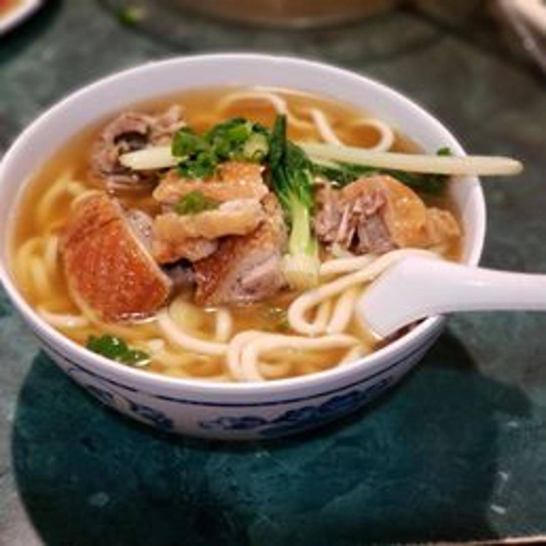 A signature dish showcasing freshly hand-pulled noodles, renowned for their exceptional chewiness and unique texture. These artisanal noodles are served with tender, flavorful duck, often immersed in a savory broth or tossed in a special house sauce, celebrating the art of noodle making.