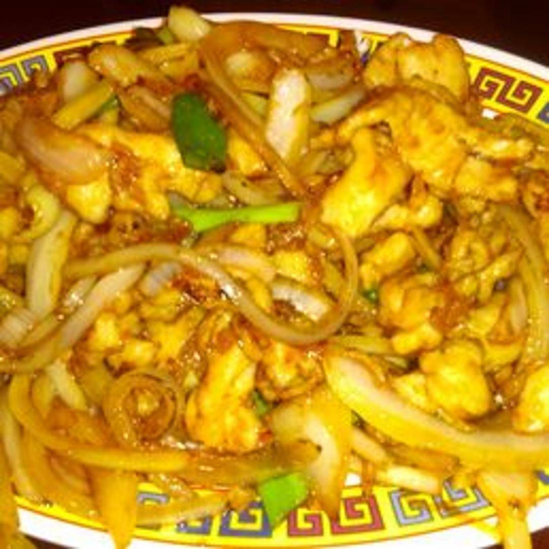 Tender pieces of chicken stir-fried with scallions and onions in a savory and slightly sweet Mongolian sauce. Served over crispy fried noodles.