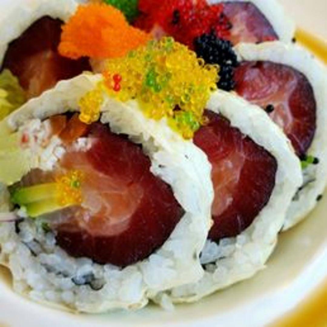 A signature roll featuring a combination of fresh seafood and vibrant flavors. Expect a medley of textures and tastes, likely including ingredients such as tuna, salmon, yellowtail, avocado, and special sauces.