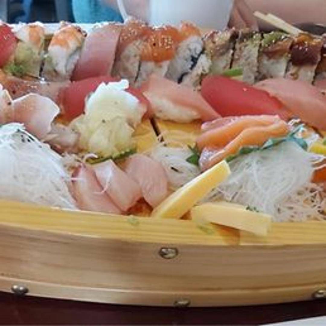 An impressive assortment of sushi and sashimi artfully arranged on a decorative boat platter. Perfect for sharing, this offering typically includes a variety of nigiri (sliced fish over rice), maki rolls (rolled sushi), and elegantly presented sashimi (slices of raw fish).