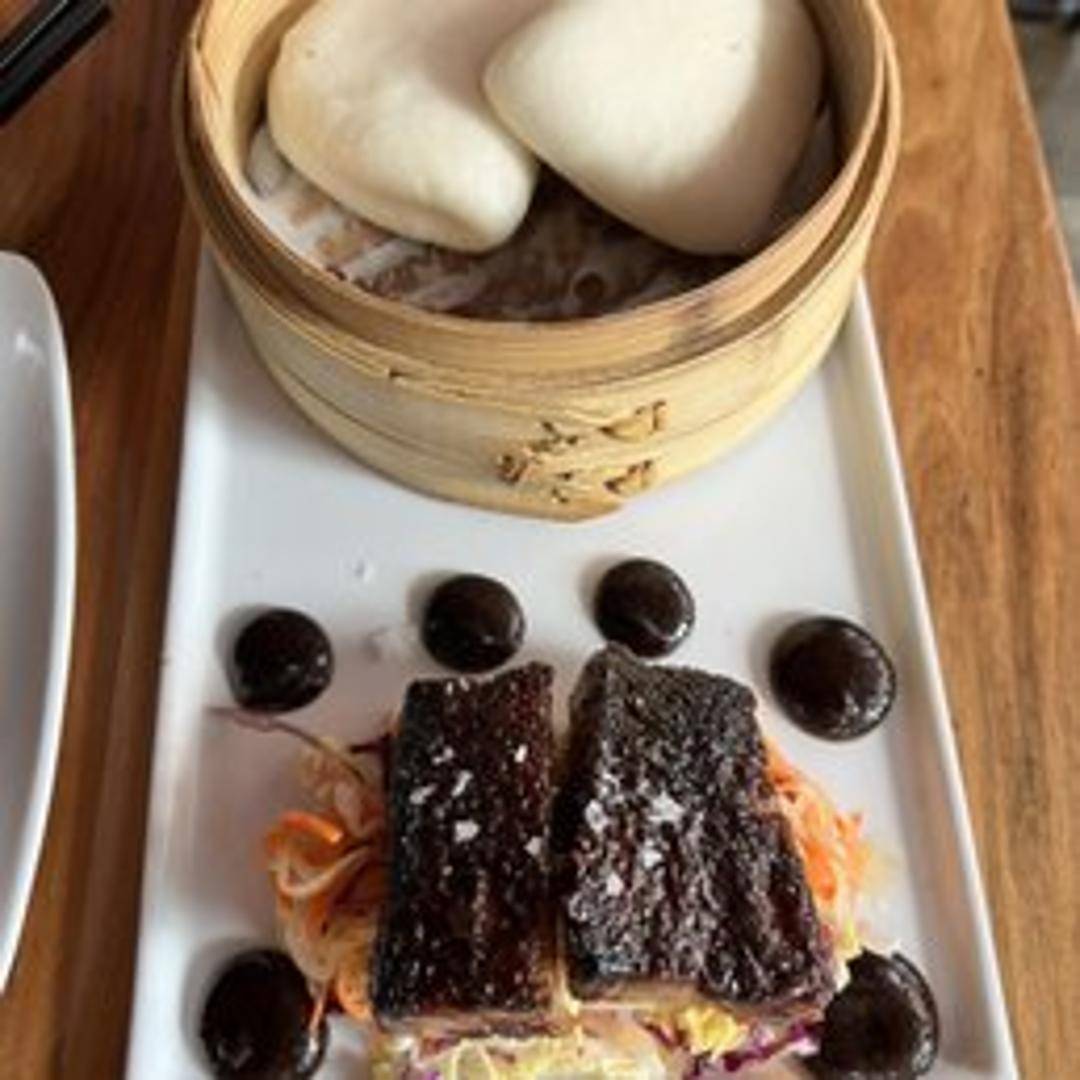 Fluffy steamed buns filled with tender pork belly, pickled vegetables, and a sweet and savory sauce.