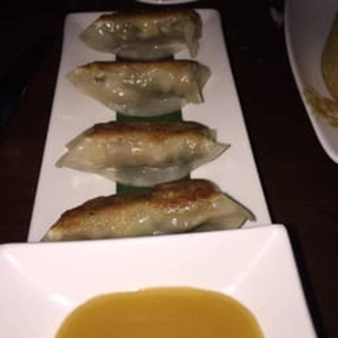 Pan-fried dumplings filled with savory meat and vegetables. Served with a dipping sauce.