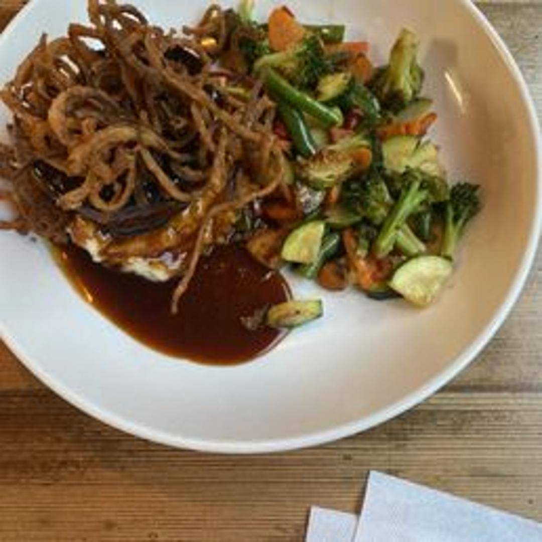 A hearty slice of meatloaf wrapped in crispy bacon, grilled to perfection. Served with a side of your choice.