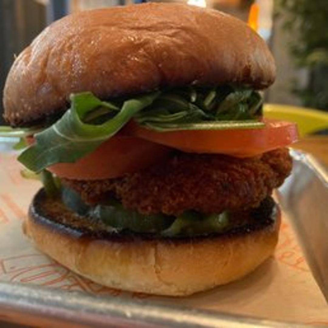 A crispy, golden-brown chicken breast served on a toasted bun with lettuce, tomato, pickles, and a signature sauce. Served with your choice of side.