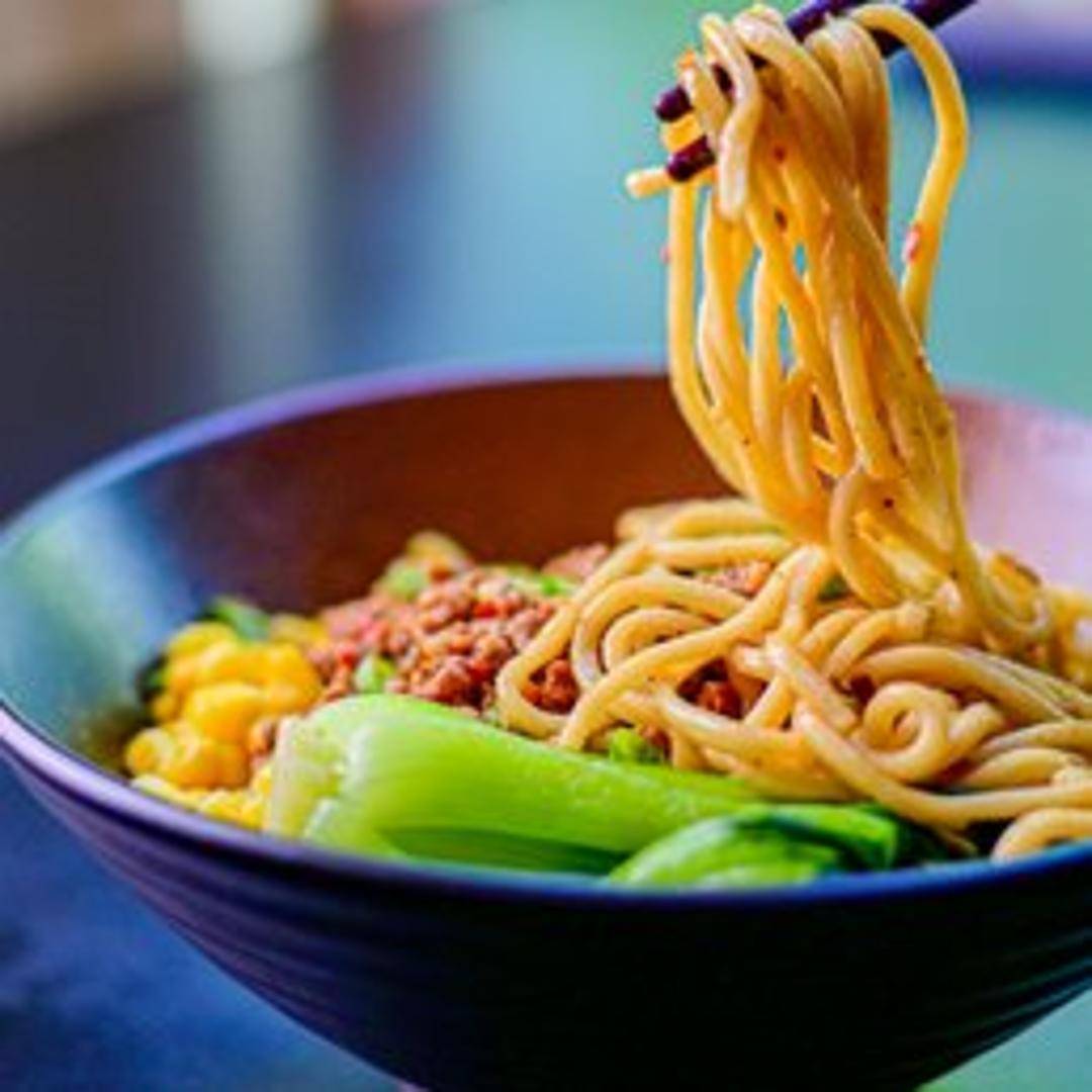 Spicy and savory noodles in a rich sauce with ground pork, preserved vegetables, and chili oil. Garnished with peanuts and green onions.
