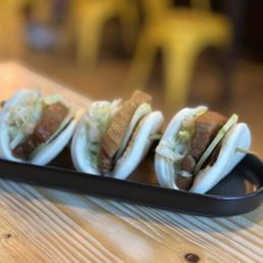 Soft and pillowy steamed buns filled with tender slices of braised pork belly, pickled vegetables, and a sweet and savory sauce.