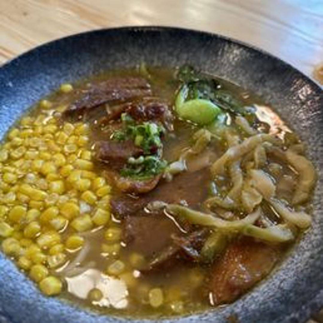 Savory pork belly slices served over noodles in a flavorful broth. Garnished with fresh herbs and vegetables.