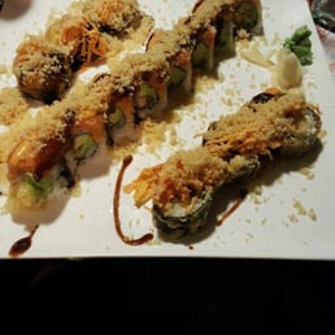 An exciting and flavorful signature roll, often featuring a base roll generously crowned with a baked or seared medley of tender seafood (such as scallops, crab, or tuna) blended with a rich, spicy, or creamy sauce, sometimes garnished with tobiko and scallions for an explosive taste experience.