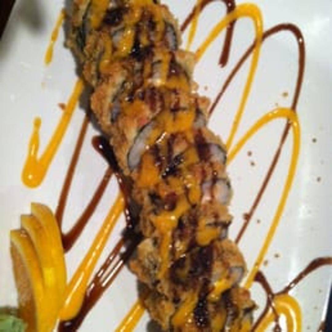 A delicious sushi roll with spicy tuna and cucumber inside, topped with avocado and a drizzle of sriracha sauce.