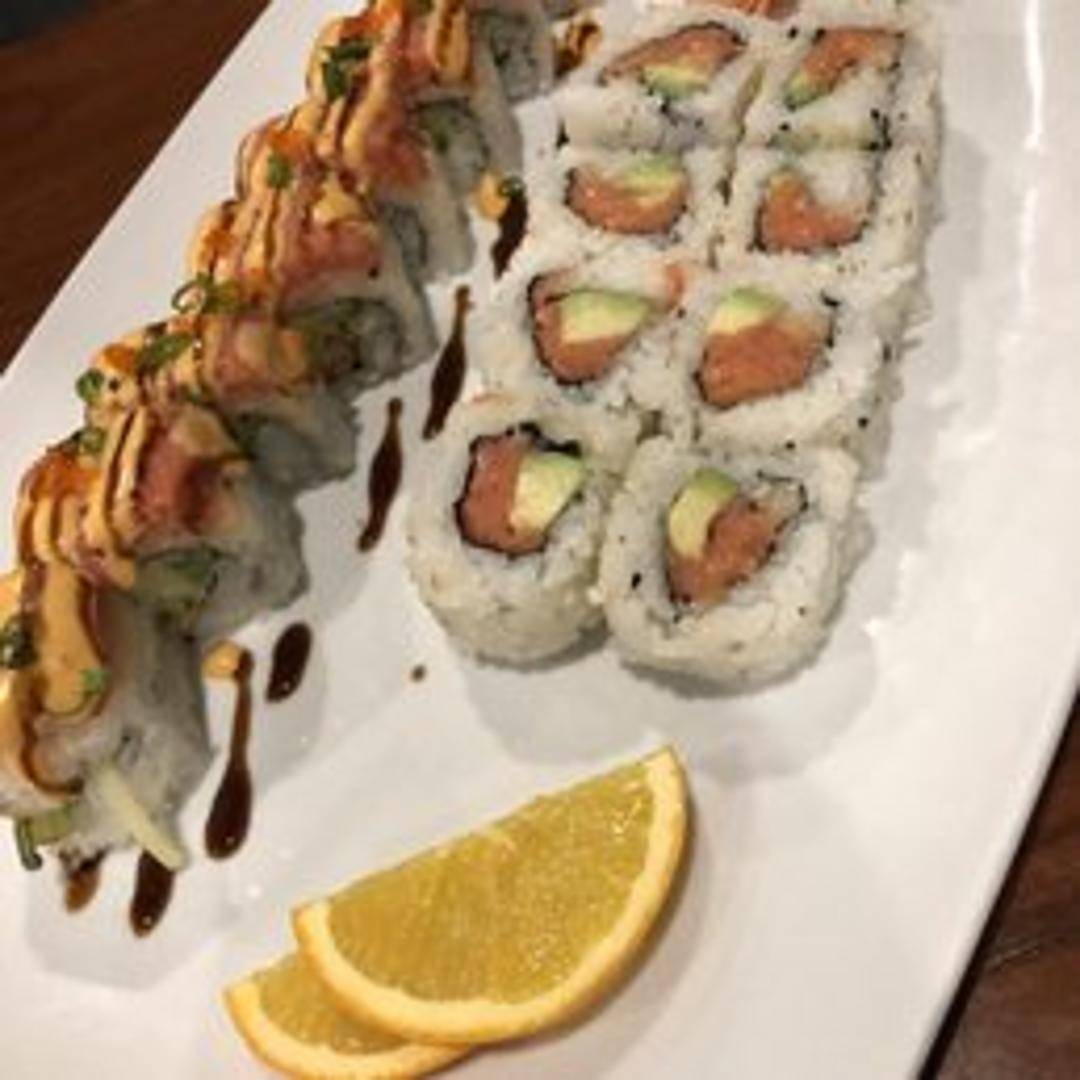 A sushi roll containing shrimp tempura, cream cheese, and avocado, topped with spicy tuna, eel sauce, and sesame seeds.