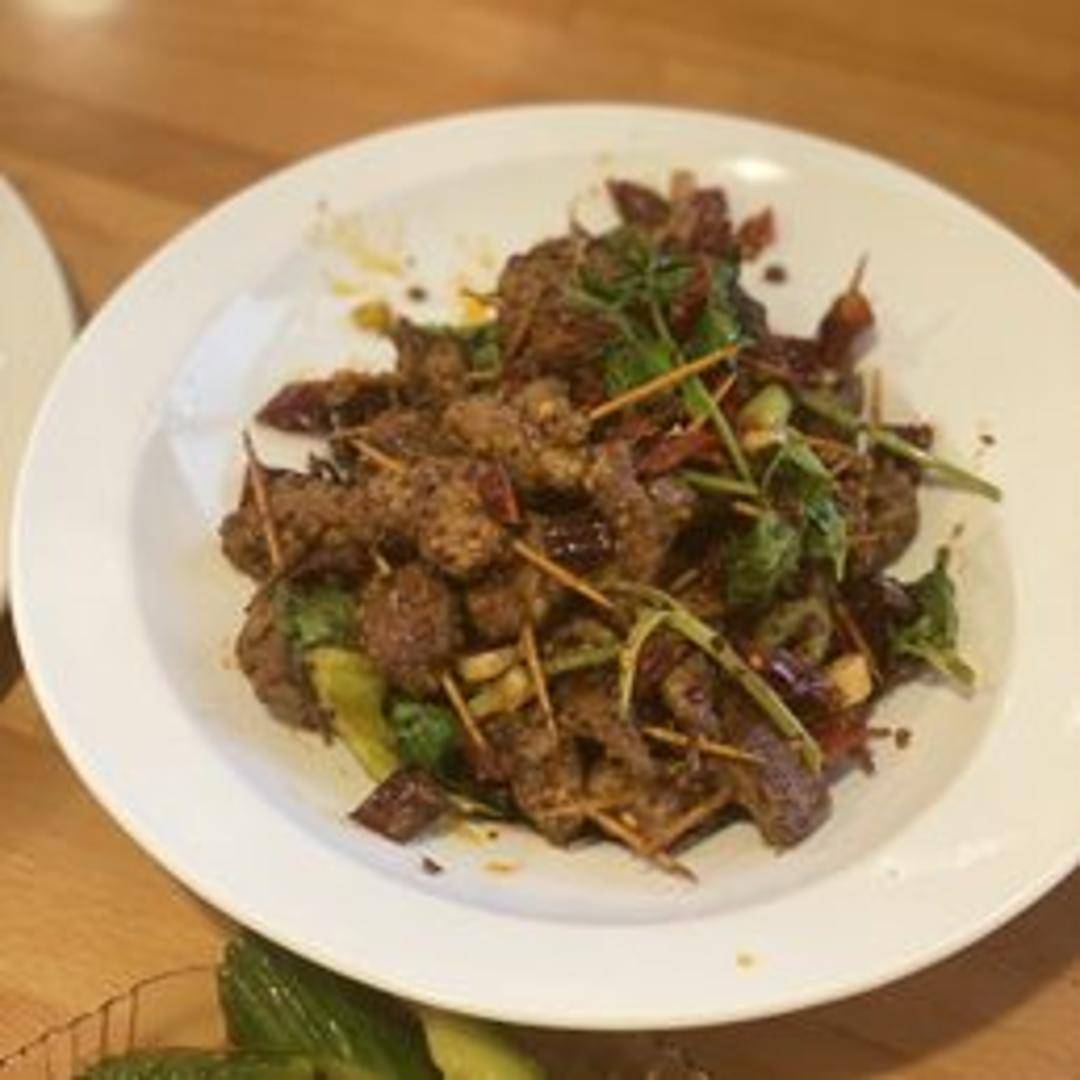 A flavorful Szechuan specialty featuring bite-sized pieces of tender lamb, expertly stir-fried with an aromatic blend of cumin, dried chilies, and Szechuan peppercorns. This dish offers a savory, spicy, and slightly numbing sensation, often served on toothpicks for easy enjoyment.