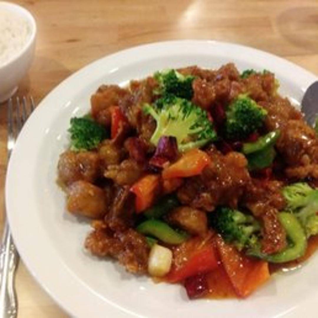 Crispy bites of tender chicken, lightly breaded and fried, then tossed in a vibrant, sweet, and tangy sauce infused with fresh orange zest and a hint of ginger and garlic, delivering a classic and beloved flavor profile.