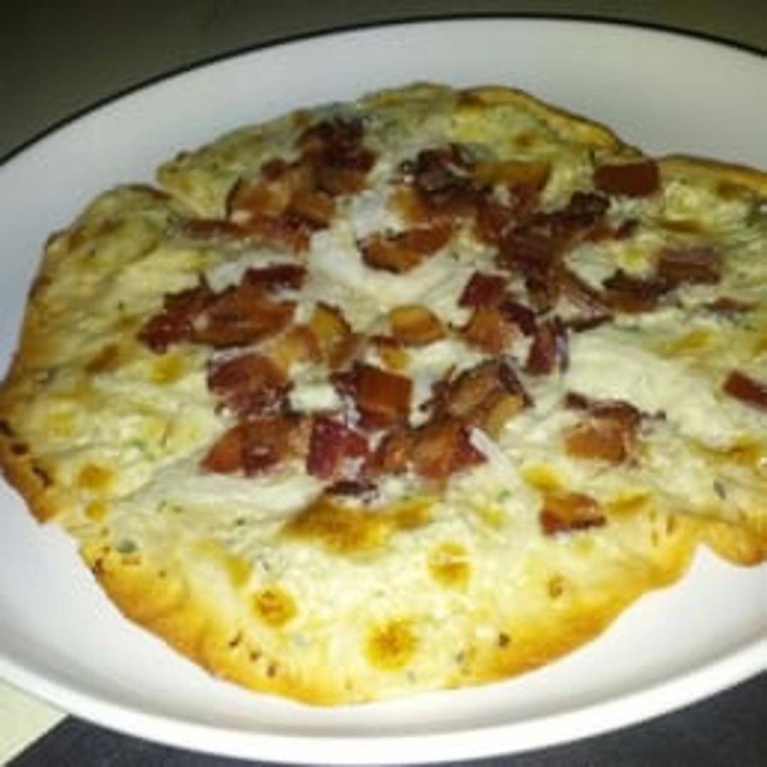 A culinary masterpiece on a crisp, hand-stretched artisanal crust, generously topped with savory, smoked Applewood bacon, a blend of premium mozzarella and fontina cheeses, and a rich, roasted garlic crème fraîche. Finished with fresh herbs for an unforgettable flavor profile.