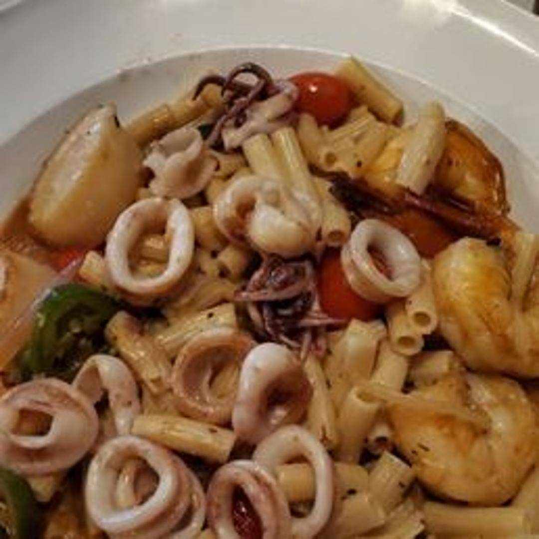 A spicy seafood pasta dish featuring shrimp, mussels, calamari, and scallops simmered in a fiery marinara sauce with a touch of red pepper flakes. Served over linguine.