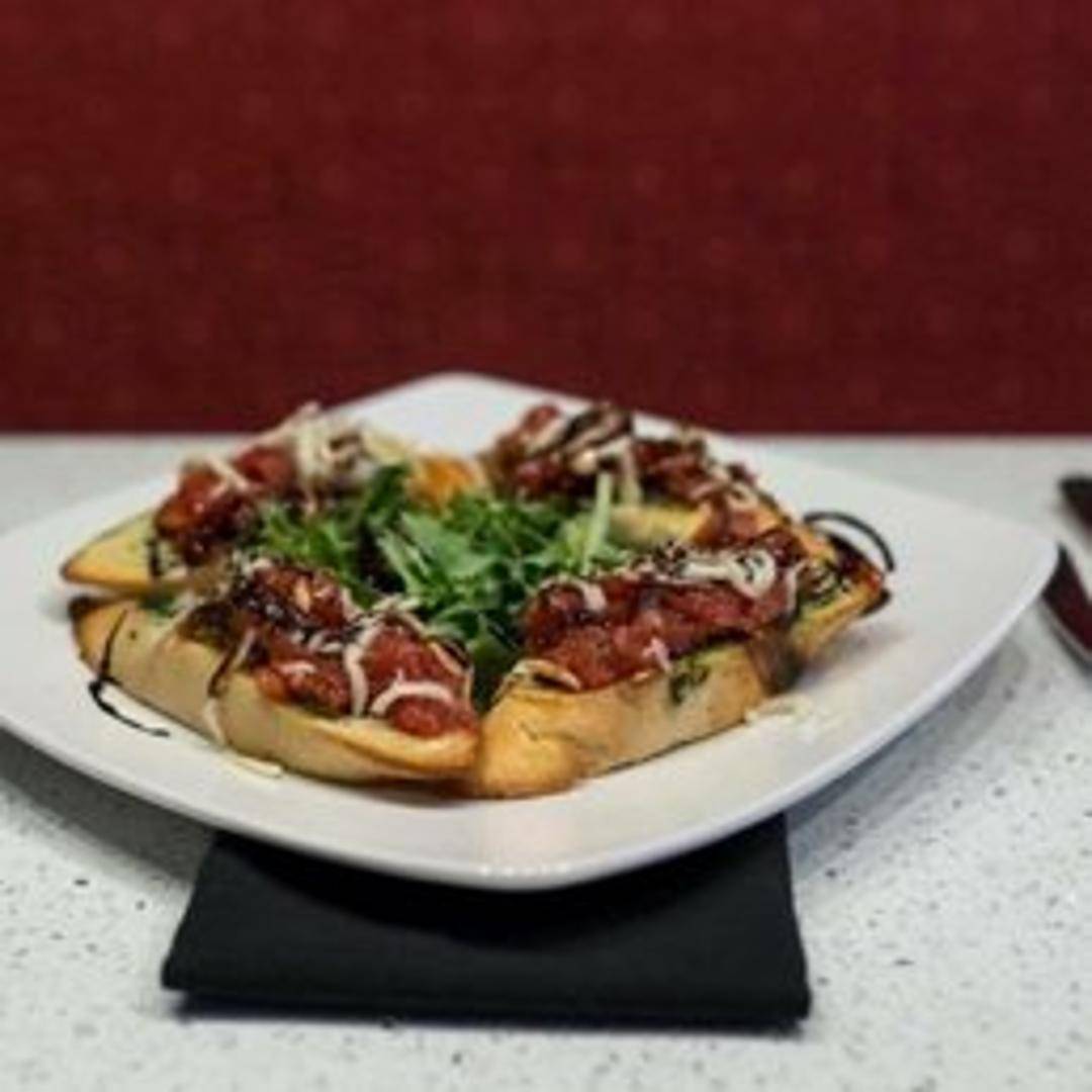 Toasted Italian bread topped with a mixture of fresh diced tomatoes, garlic, basil, and a drizzle of balsamic glaze.