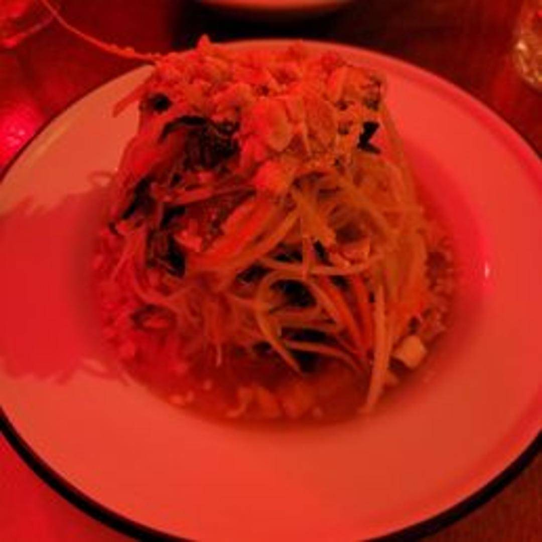 A refreshing and vibrant salad featuring shredded green papaya, tomatoes, long beans, peanuts, and a spicy lime dressing. A delightful balance of sweet, sour, and savory flavors.
