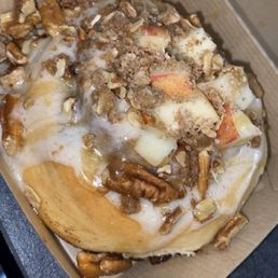 A Cinnaholic roll topped with caramel frosting, apple pie filling, and pie crumble.