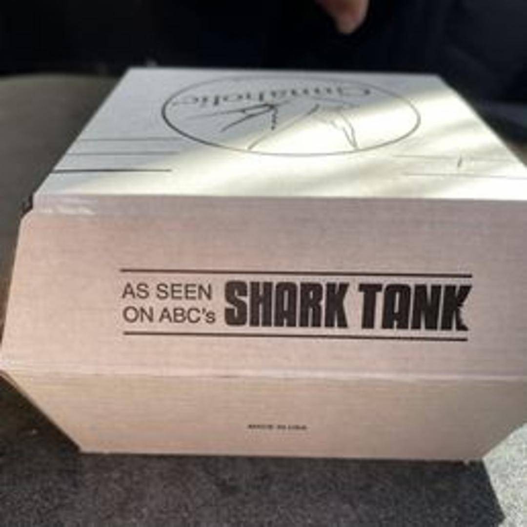 A classic Cinnaholic roll topped with blue vanilla frosting, a gummy shark, and a dusting of blue sprinkles.