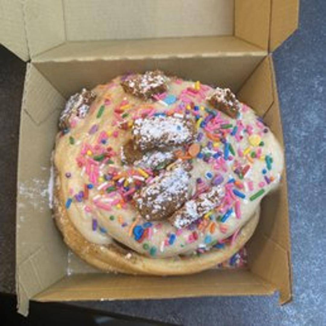 A Cinnaholic roll topped with Biscoff cookie spread, Biscoff cookies, and powdered sugar.