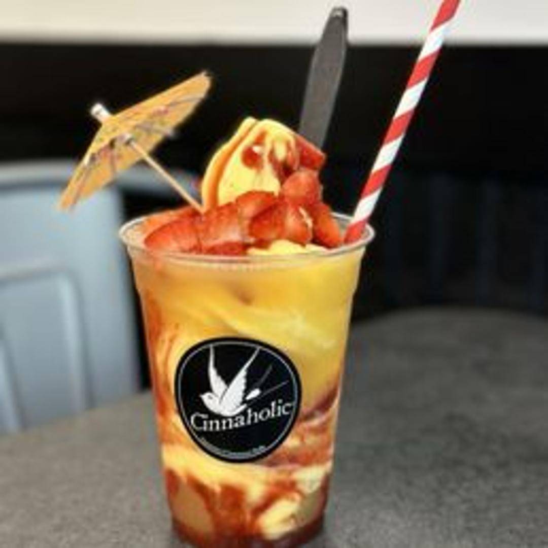 A Cinnaholic roll topped with pineapple frosting, pineapple chunks, and a dusting of powdered sugar.