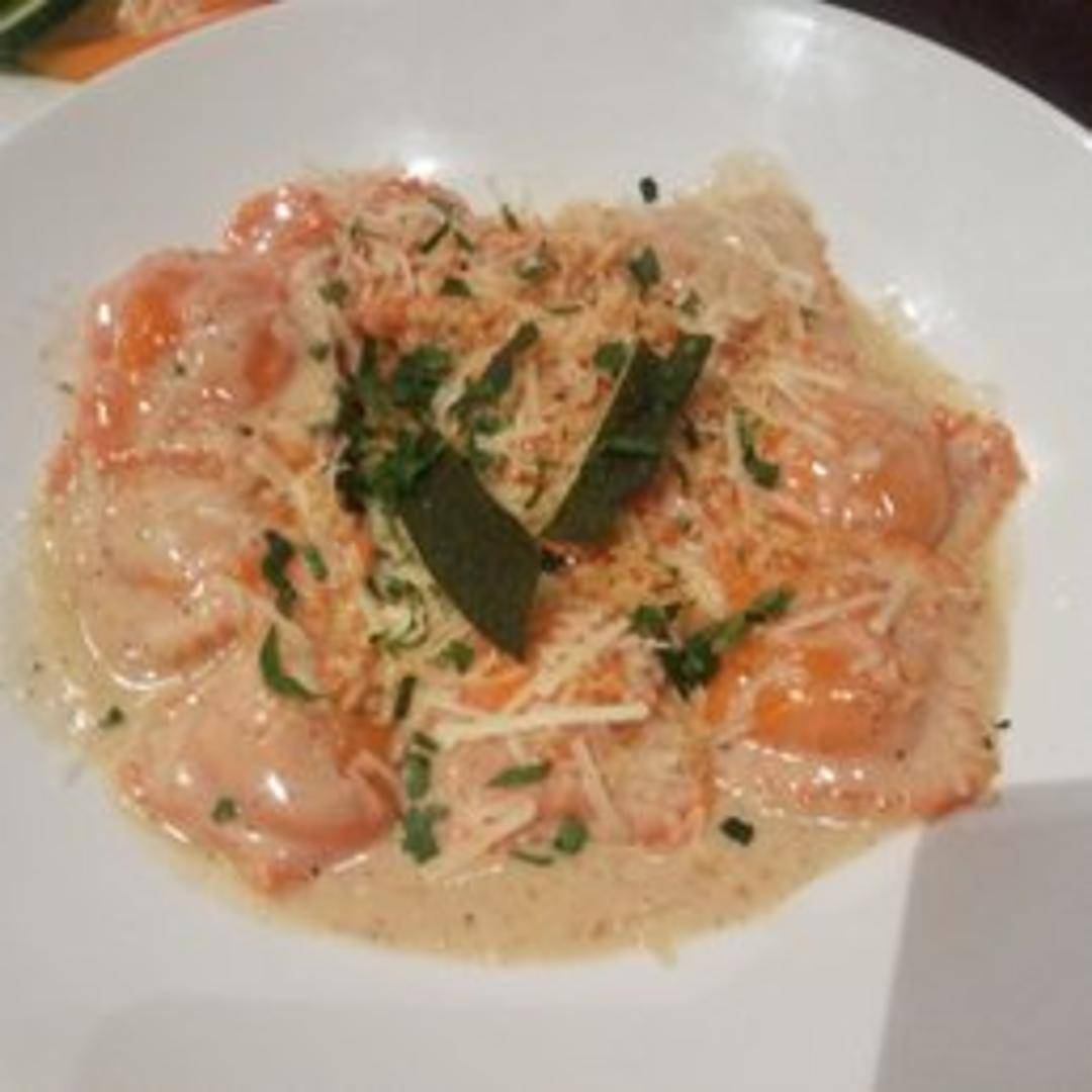 Delicate, handcrafted pasta pockets generously filled with a rich, creamy pumpkin puree, delicately seasoned with fall spices. Served in a luscious sage brown butter sauce and garnished with toasted pumpkin seeds and a sprinkle of Parmesan cheese for a comforting and flavorful experience.