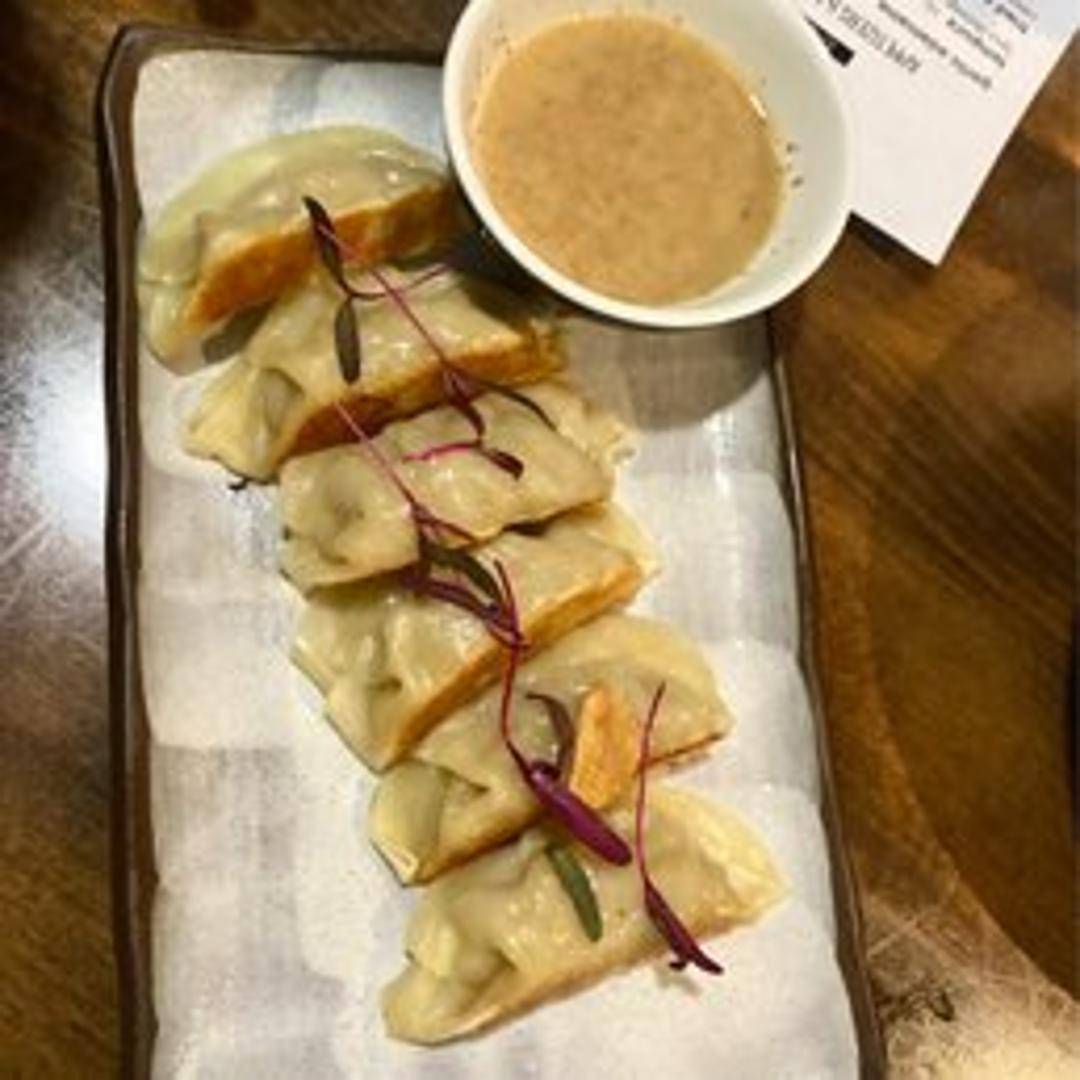 Pan-fried or steamed Japanese dumplings filled with a savory mixture of ground meat (typically pork), vegetables such as cabbage and chives, and seasonings. Served with a dipping sauce, usually a blend of soy sauce, rice vinegar, and chili oil.