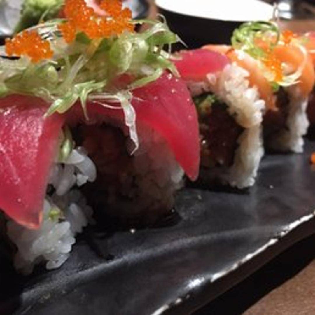 A sushi roll featuring a combination of flavors and textures. Likely contains imitation crab or real crab meat, avocado, and cucumber inside, wrapped in nori seaweed and sushi rice. Topped with salmon and a spicy mayonnaise-based sauce, often referred to as spicy mayo or sriracha mayo. The sauce provides a creamy, spicy kick that complements the richness of the salmon and the freshness of the other ingredients. May be garnished with sesame seeds or masago (fish roe).