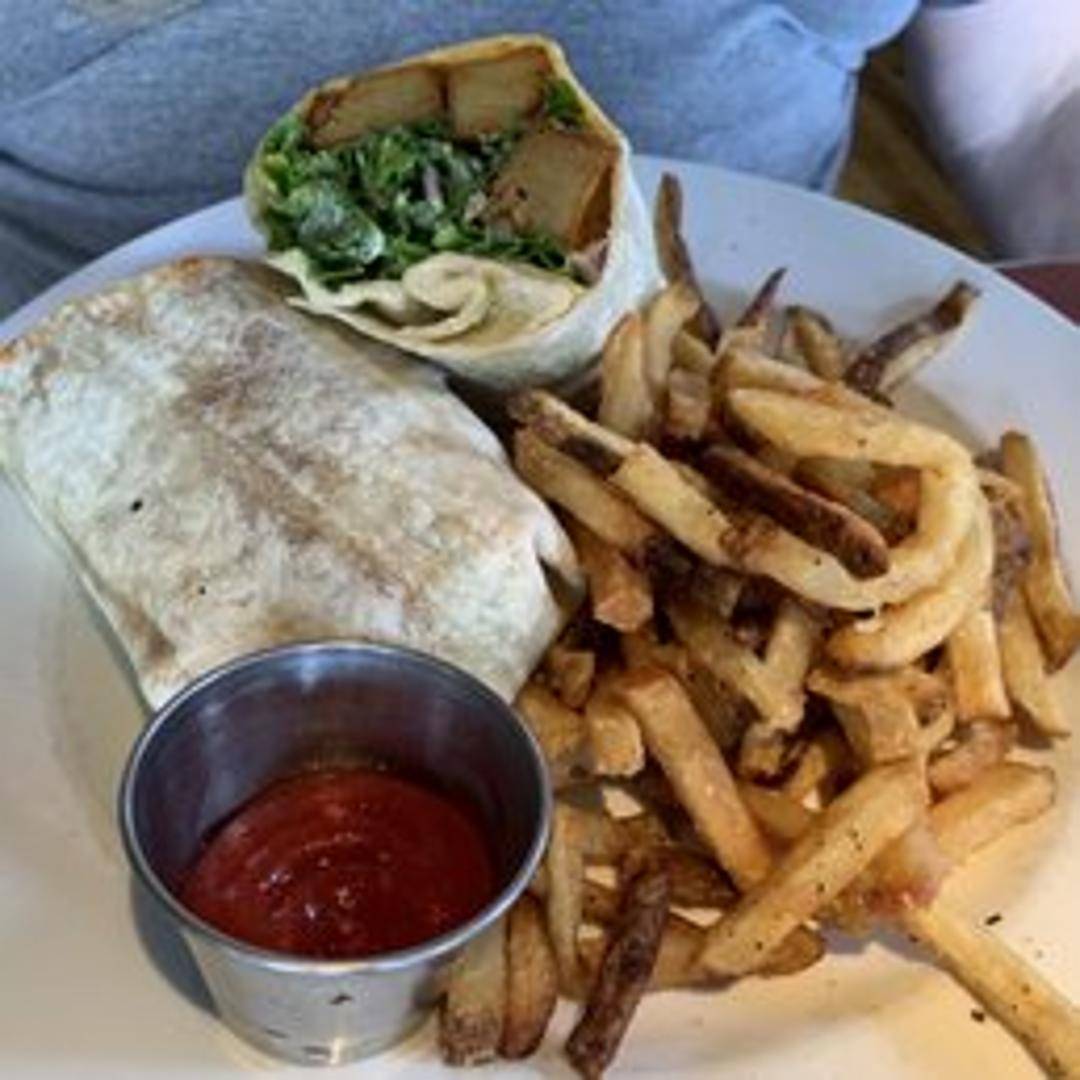 Spicy buffalo-style seitan, lettuce, tomato, and vegan ranch dressing wrapped in a warm tortilla.