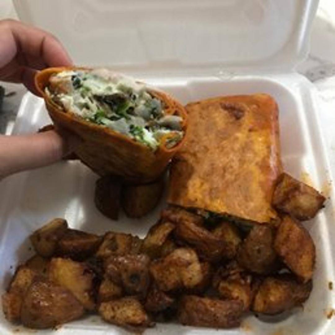 Scrambled eggs, sausage, cheddar cheese, and potatoes wrapped in a warm flour tortilla. Served with a side of salsa.
