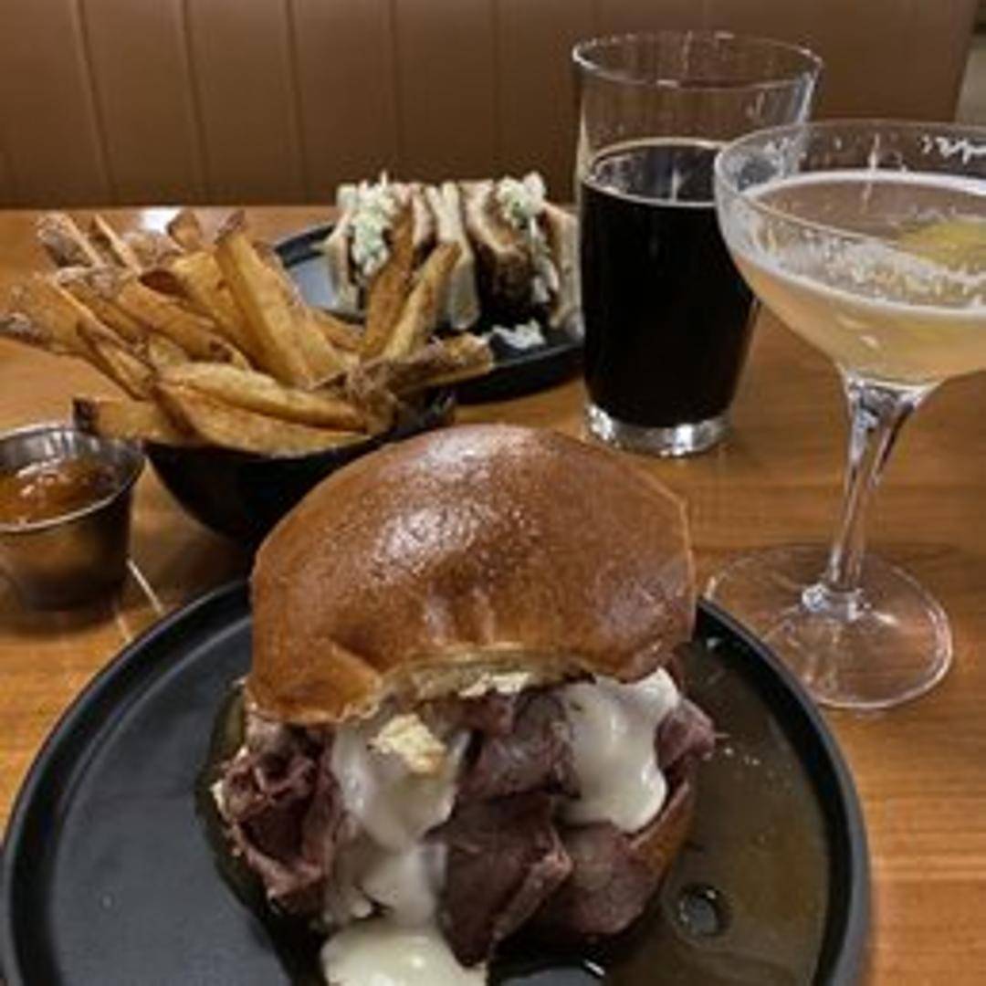 A robust sandwich featuring thinly sliced, slow-roasted prime beef, perfectly tender and flavorful. Piled high on a crusty baguette or artisanal roll, complemented by caramelized onions, a zesty horseradish cream, and melted provolone cheese. Served with a side of rich au jus for dipping.