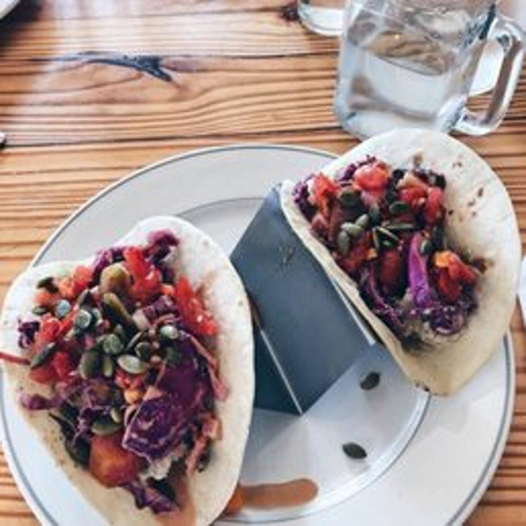 Two warm corn tortillas generously filled with perfectly seasoned and pan-fried crispy tofu, fresh shredded cabbage, a vibrant pico de gallo, and drizzled with a zesty cilantro-lime crema. A delightful combination of textures and fresh flavors, offering a satisfying crunch in every plant-based bite.