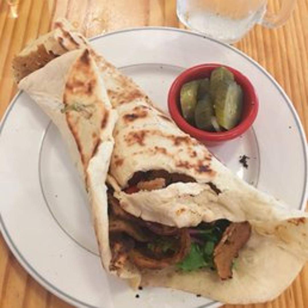 Experience the beloved flavors of a traditional gyro, reimagined for a plant-based diet. Savory, spiced vegan meat alternative is nestled in a warm, soft pita with crisp lettuce, fresh tomatoes, red onion, and a generous dollop of creamy, tangy vegan tzatziki sauce.