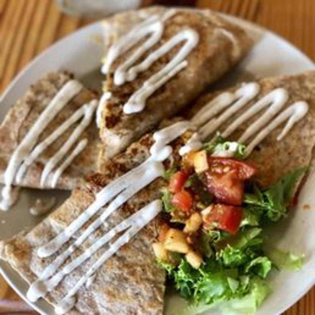 A hearty and savory breakfast delight featuring a large flour tortilla grilled to perfection and generously filled with fluffy plant-based scrambled 'eggs', melted vegan cheddar cheese, and a medley of sautéed bell peppers and onions. Served with a side of salsa for dipping.