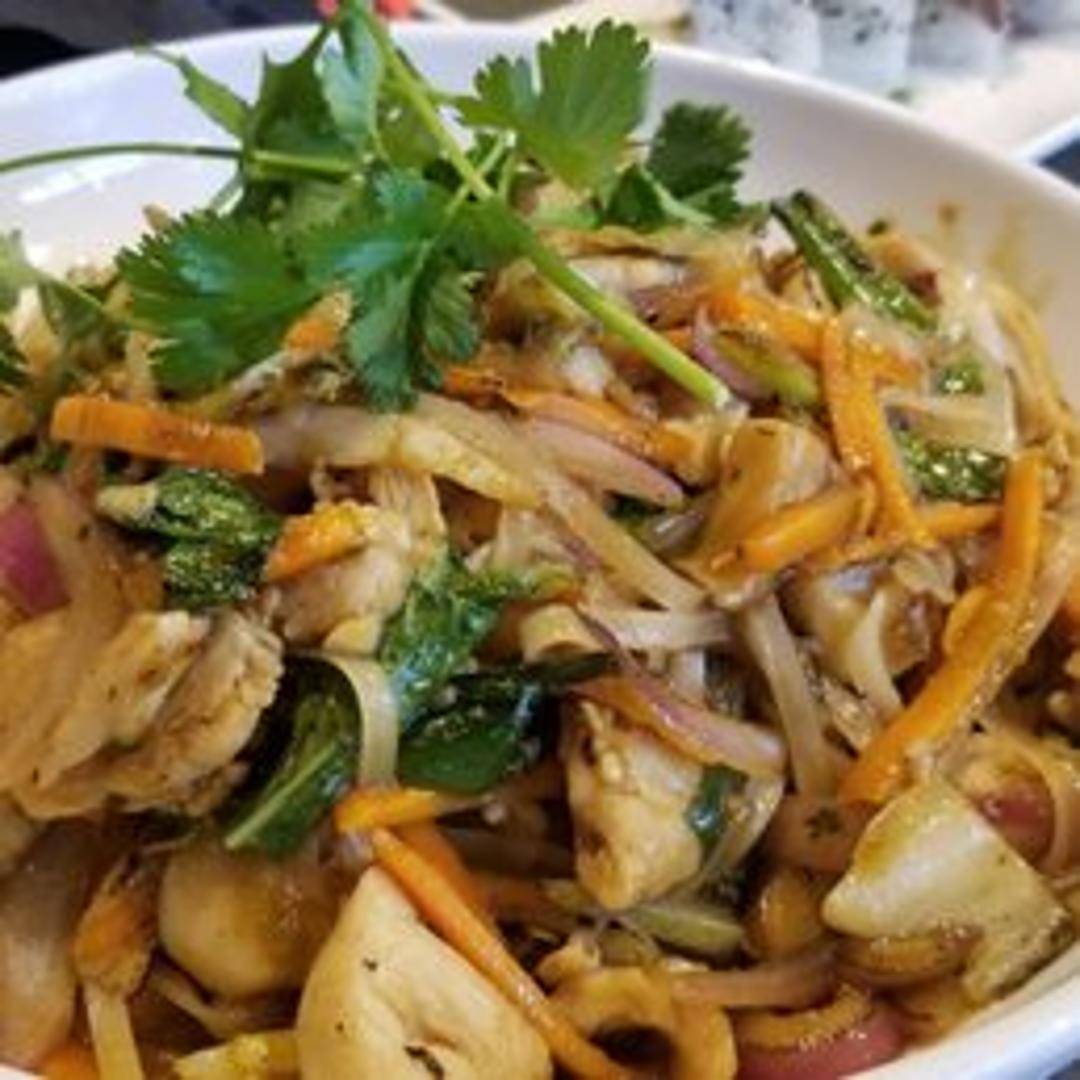 A vibrant and spicy Thai stir-fry featuring wide rice noodles wok-tossed with your choice of protein (chicken, beef, or tofu), fresh basil leaves, crunchy bell peppers, onions, and tender green beans. The dish is characterized by its bold, savory sauce with a hint of chili heat.