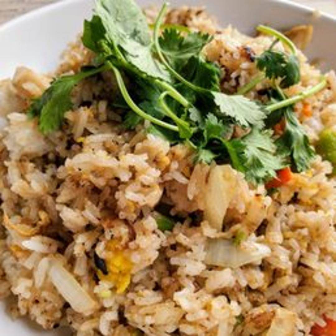 A classic Vietnamese-style fried rice, wok-tossed with fragrant jasmine rice, a medley of fresh vegetables such as peas, carrots, and corn, and your choice of tender protein like chicken, beef, or shrimp. Seasoned with savory soy sauce and aromatic spices for a comforting and flavorful dish, often garnished with fresh scallions.